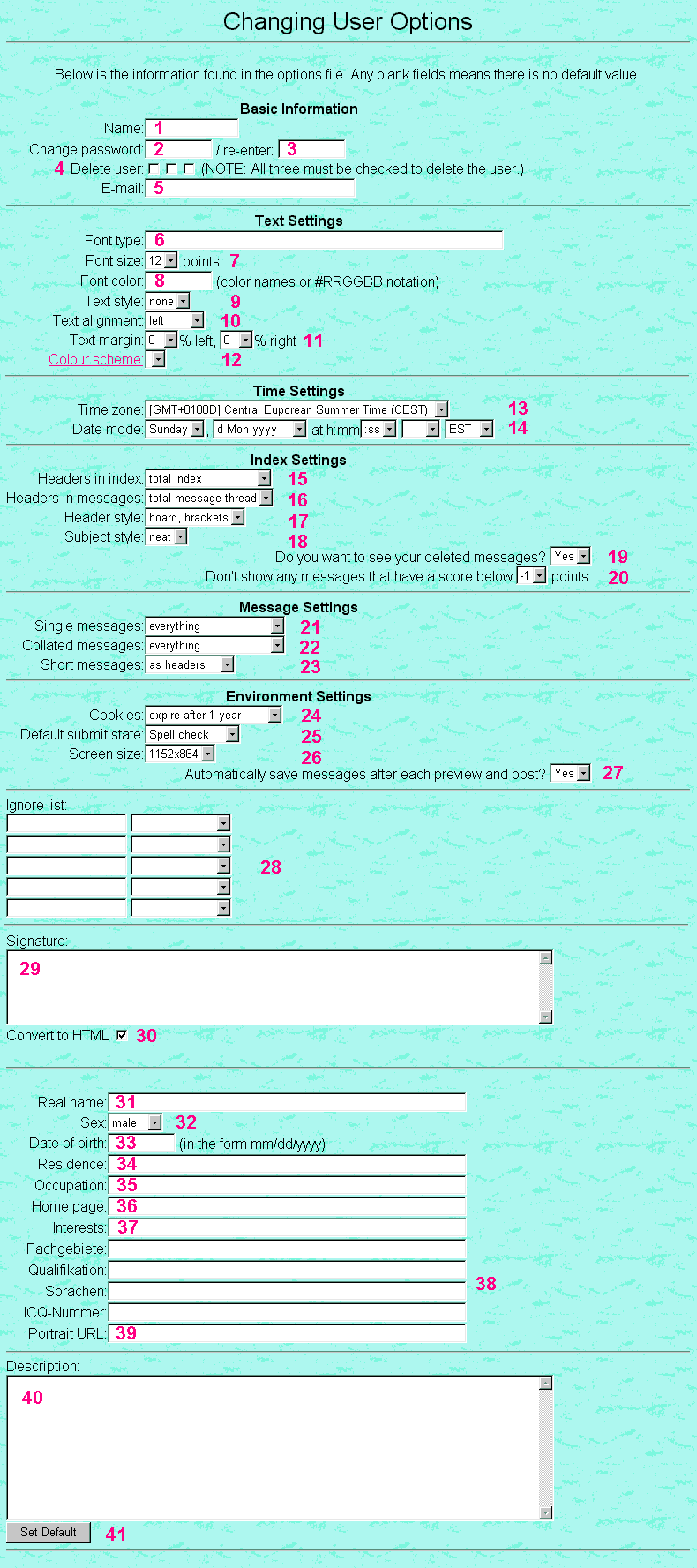 Emoticons werden durch Einfügung von bestimmten Zeichenkombinationen erzeugt. Sie können sowohl im Text, als auch in der Signatur oder der Thema-Zeile verwendet werden. Folgende Emoticons sind implementiert: